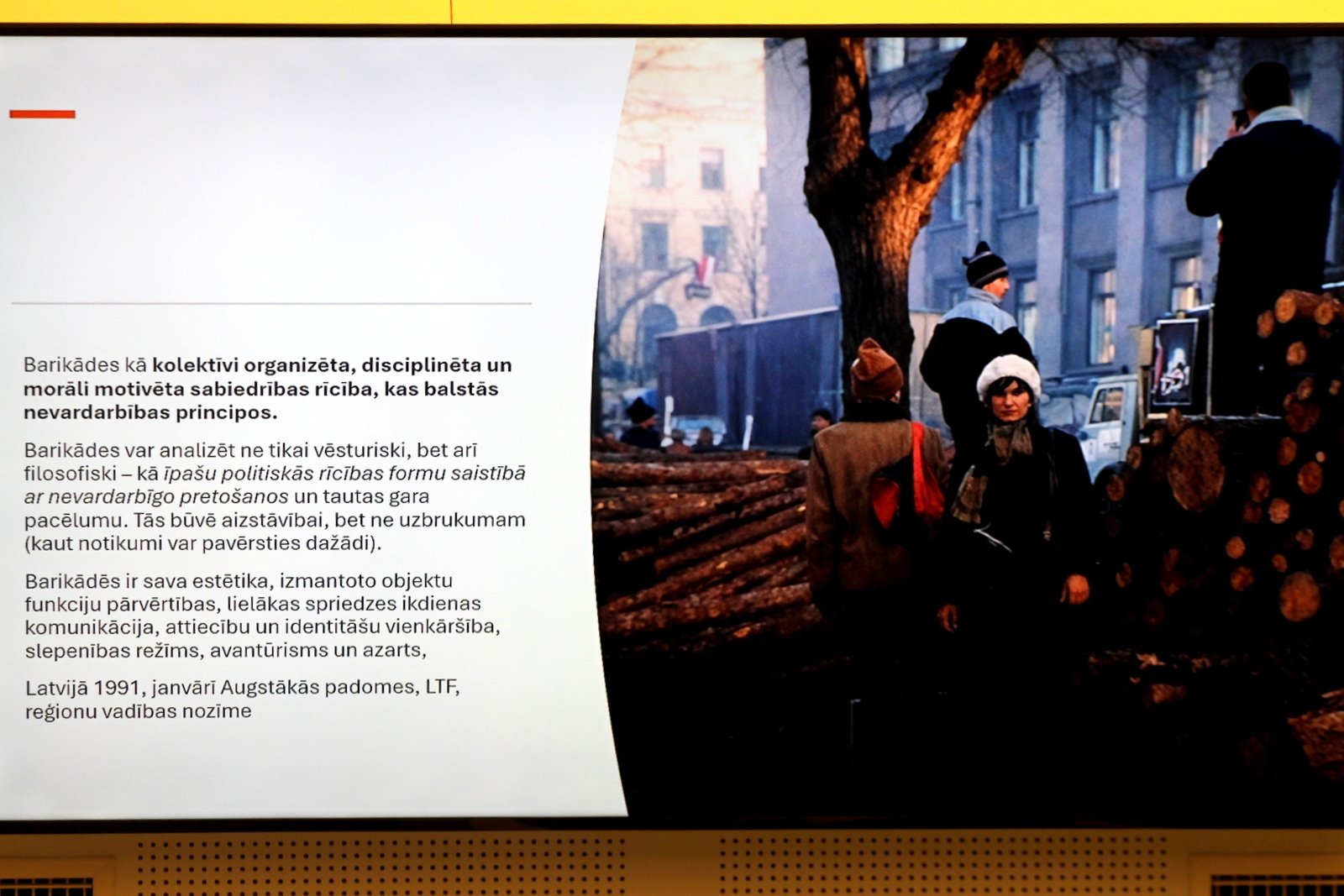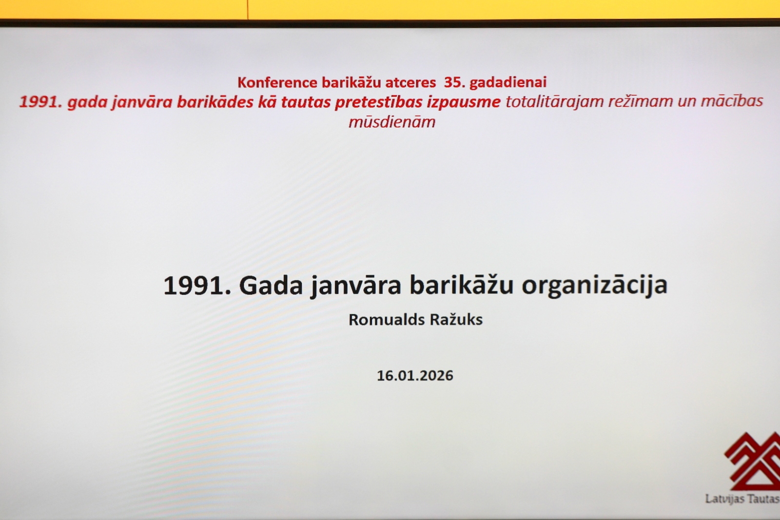 Piektdien, 2026. gada 16. janvārī no plkst. 10.00 līdz 15.00 Saeimas Baltiešu zālē un tiešsaistē – konference “1991. gada janvāra barikādes kā tautas pretestības totalitārajam režīmam izpausme un mācības mūsdienām”. Saeimas Baltiešu zālē un tiešsaistē norisinājās konference, kas pulcēja vēsturniekus, tiesību un drošības ekspertus, lai 1991. gada barikāžu pieredzi analizētu gan kā unikālu nevardarbīgas tautas pretestības piemēru, gan kā pamatu mūsdienu Latvijas valstiskuma un aizsardzības spēju stiprināšanai. Konferences pirmajā daļā tika skatīta barikāžu nacionālā un starptautiskā nozīme, organizācija, tautas gara pacēlums un ieguldījums Latvijas drošības pamatu veidošanā, savukārt otrajā daļā uzmanības centrā bija nevardarbīgās pretošanās tiesiskie, vēsturiskie un militārie aspekti, sabiedrības loma un gatavība nemilitārai pretestībai kara vai pagaidu okupācijas apstākļos. Diskusijās piedalījās Egils Levits, Tālavs Jundzis, Renārs Zaļais, Romualds Ražuks, Maija Kūle, Ģirts Valdis Kristovskis, Ineta Ziemele, Guntis Zemītis, Ieva Bērziņa, Vitālijs Rakstiņš u. c. Foto – Ingrīda Punka
