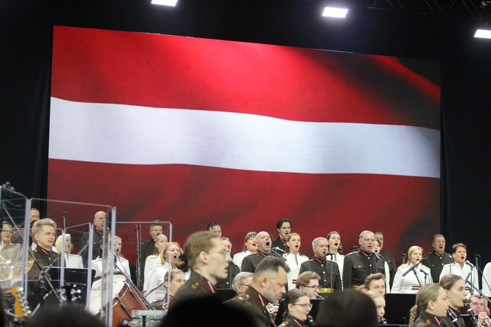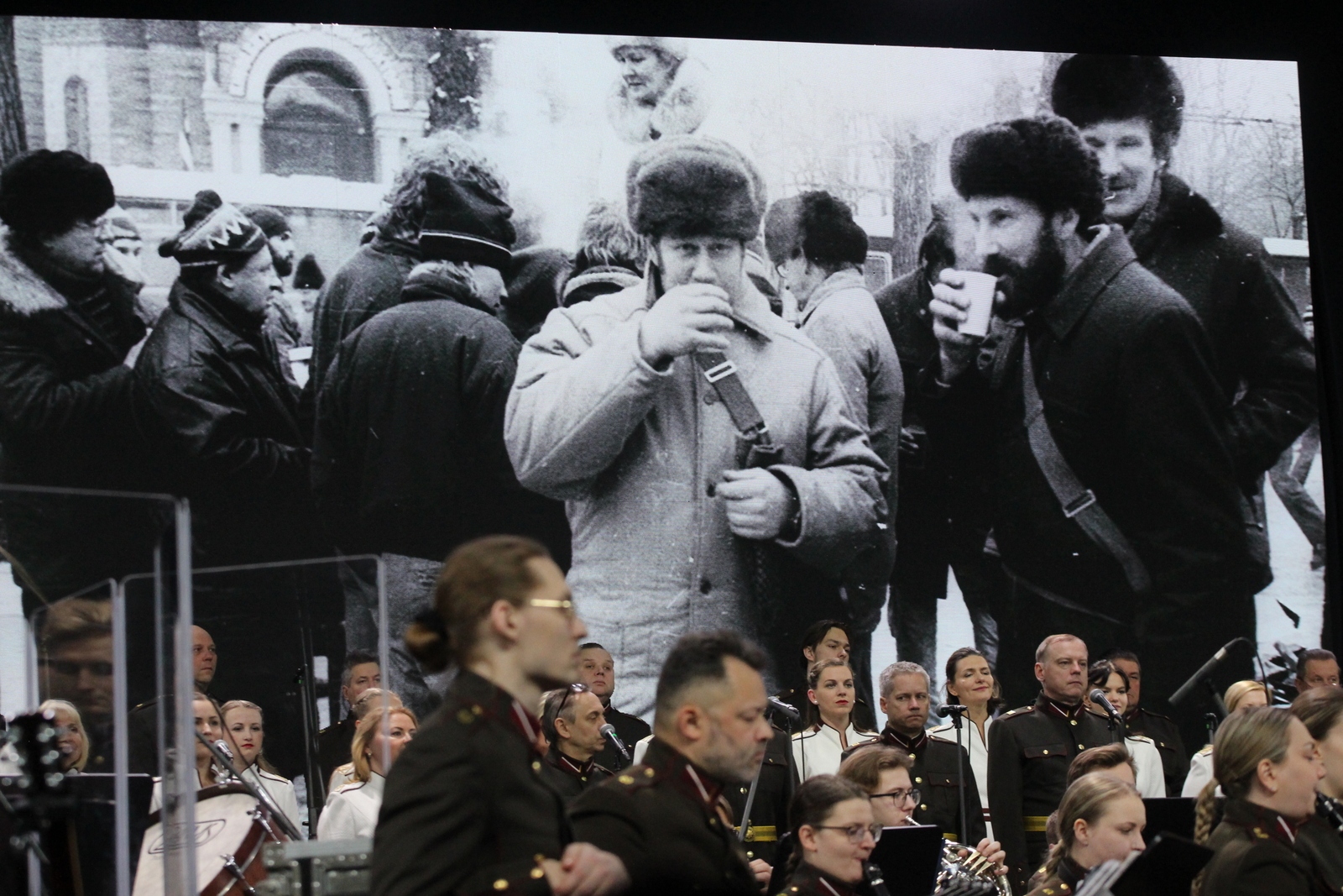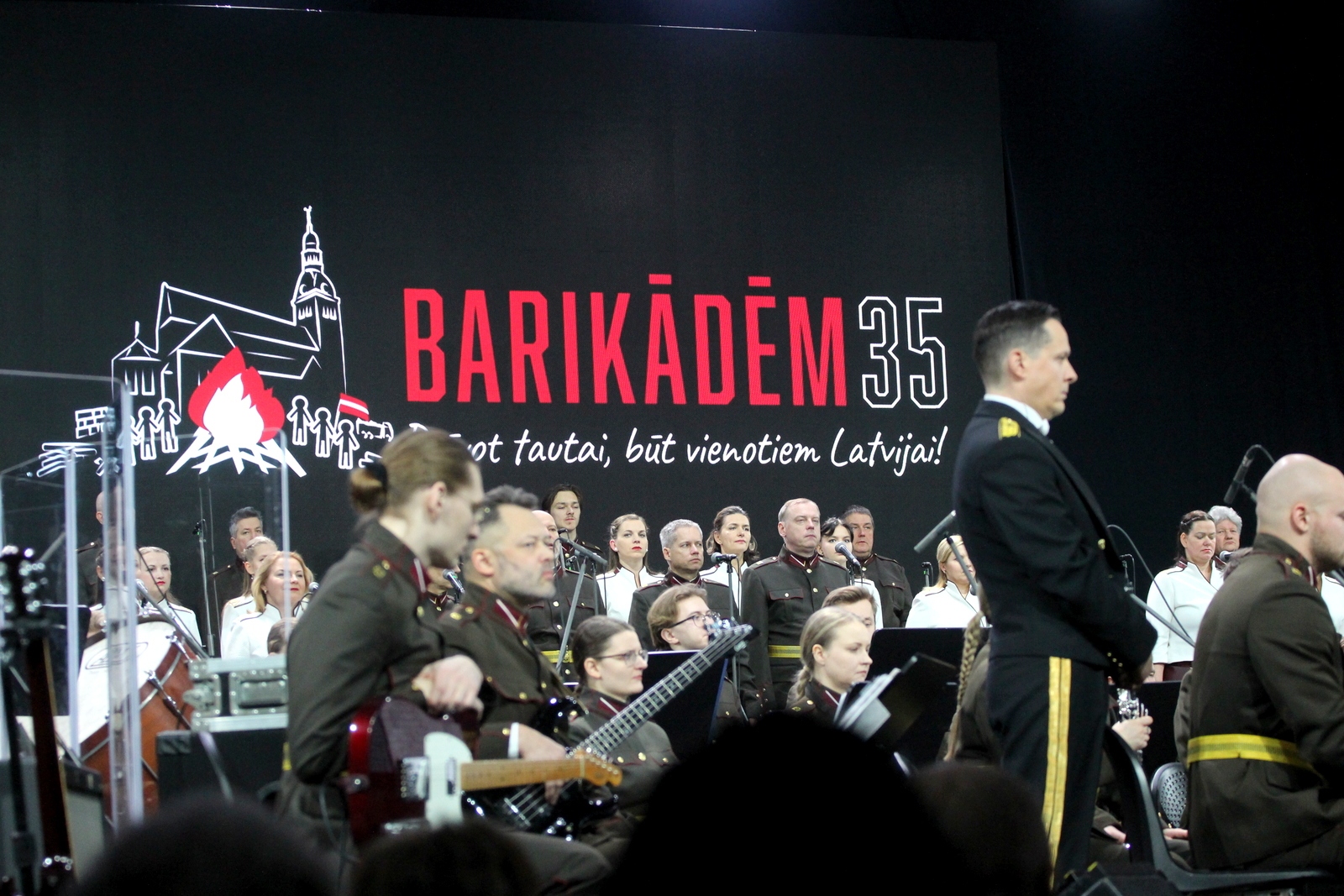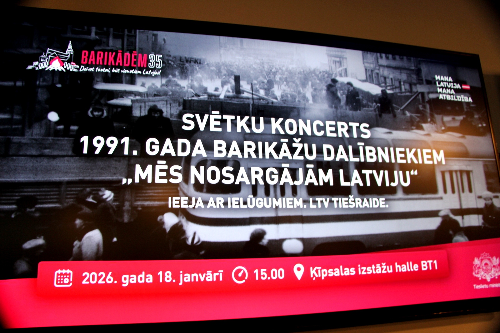 Svētdien, 2026. gada 18. janvārī plkst. 15.00, Ķīpsalas izstāžu halle BT1 – svētku koncerts “Mēs nosargājām Latviju” (LTV tiešraide). Ķīpsalas izstāžu hallē BT1 norisinājās īpašs svētku koncerts 1991. gada barikāžu dalībniekiem “Mēs nosargājām Latviju”. Koncerts bija veltīts barikāžu dalībnieku drosmei un ieguldījumam Latvijas neatkarības atgūšanā un tika raidīts LTV tiešraidē. Koncertā skanēja Zemessardzes orķestra (diriģents Andis Karelis) izpildītie skaņdarbi, tostarp Atmodas laikam raksturīgas dziesmas un to mūsdienu interpretācijas kopā ar koriem un solistiem. Kulminācija bija Jura Kulakova un Normunda Beļska kantāte “Vēstules uz bruģa”, ko atskaņoja Zemessardzes orķestris, rokgrupa “Pērkons”, bungu un dūdu grupa “Auļi”, Zemessardzes 51. kājinieku bataljona ansamblis “Dobeles zemesargi”, Rīgas kamerkoris “Ave Sol” un Zemessardzes koris “Stars”. Foto – Ingrīda Punka